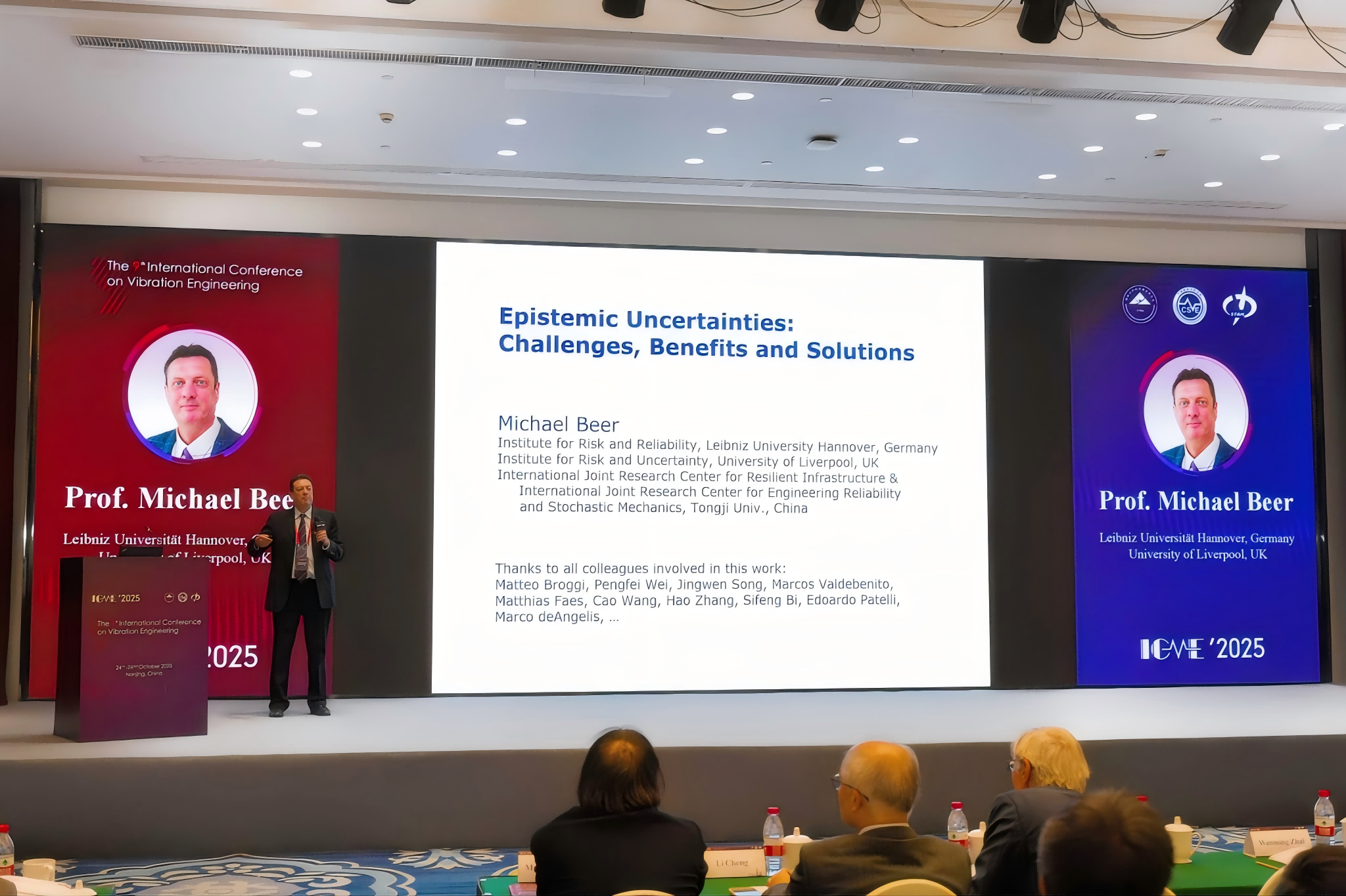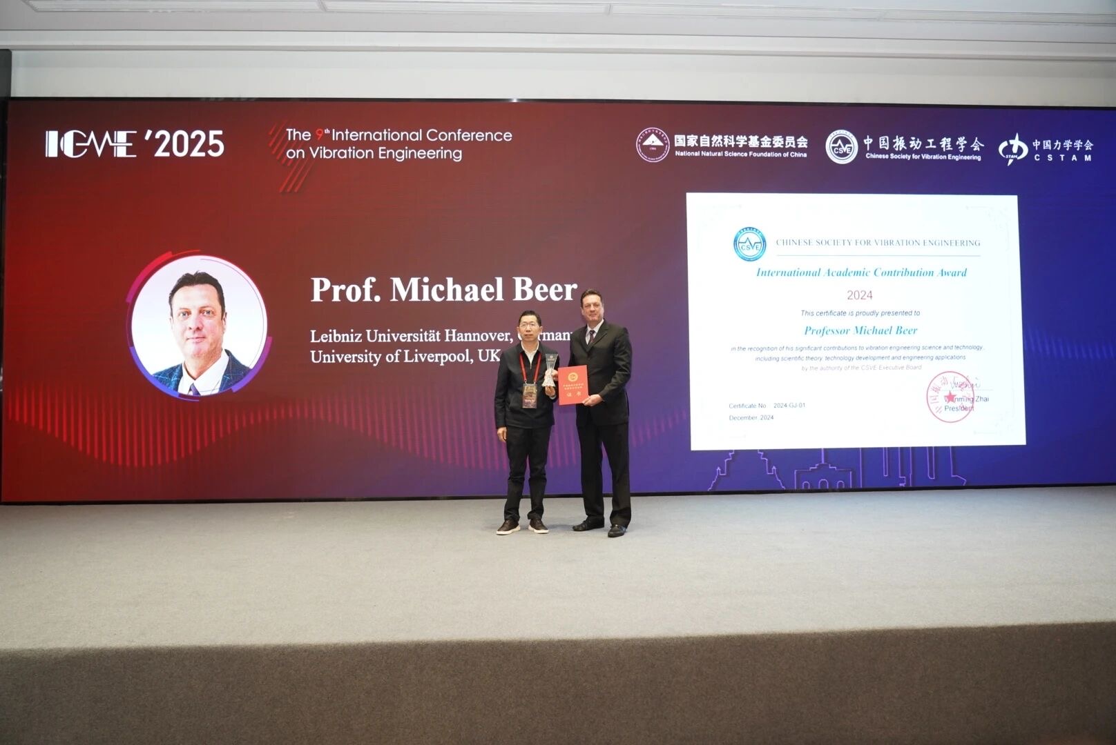 参加会议的代表来自12个国家和地区,其中包括:加拿大、德国、匈牙利、波兰、意大利、日本、瑞士、马来西亚、斯洛伐克、埃及、土耳其和中国。与会国外代表52人,国内代表395人。开幕式上,翟婉明院士为Michael Beer教授颁发了2024年度中国振动工程学会国际学术贡献奖证书。